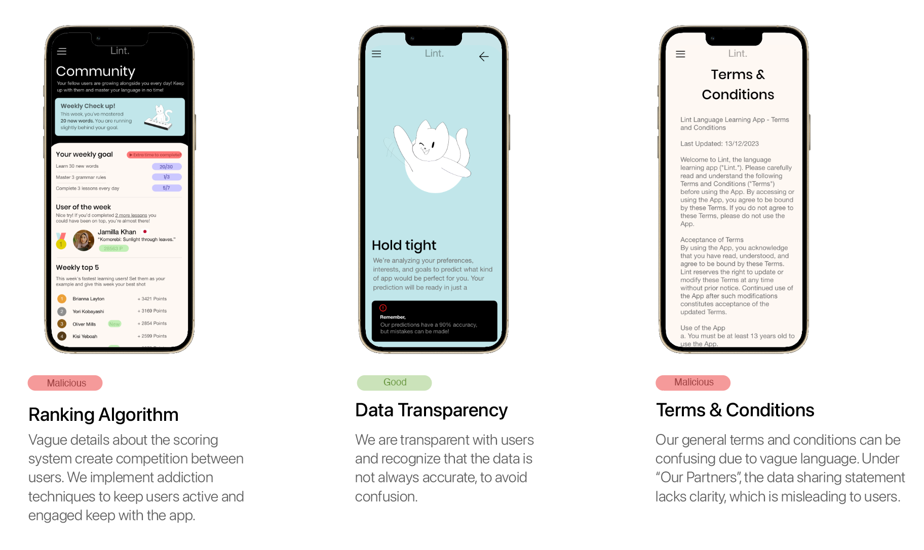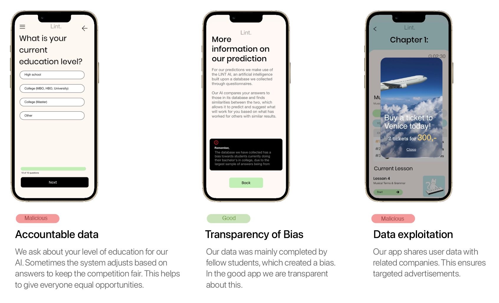 Lint is a language app for users who are interested in learning a new language. The app is based on data experiments we conducted ourselves. One app had to be harmless, while the other was meant to be harmful.