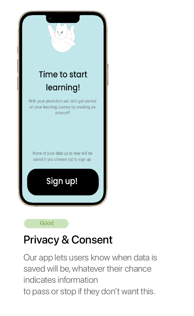 In the Good app, we aim to create a positive and ethical learning environment for the user. We collect data transparently and respect users’ privacy. Our focus is on inclusivity, support, and personalized learning based on interests and learning methods.